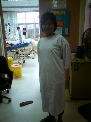 kalau ikutkan waktu melawat, memang kami tidak dibenarkan masuk sebab waktu melawat jam 1. ayah punya beriya2 minta kebenaran dari nurse tu. dia kata baru sampai dari kl dan petang tu nak terus balik. memang betul pun. cuma ayah je yang akan balik kl awal. aciq sempat lagi posing dengan baju yang kami kena pakai untuk masuk wad icu tu. ayah dah pun ada kat dalam.